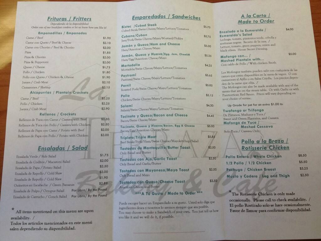 Sautéed meat or chicken accompanied by rice and French fries Carne Encebollada Acompañada de Arroz, Frijoles y Maduros $1275 Grill steak & onions with a side of rice, beans and sweet plantains Apanado de Carne, Pollo o Cerdo, Acompañado de Arroz, Ensalada y Papas Fritas $1275. Menu for La Terraza Bakery provided by Allmenuscom DISCLAIMER Information shown may not reflect recent changes Check with this restaurant for current pricing and menu information A listing on Allmenuscom does not necessarily reflect our affiliation with or endorsement of the listed restaurant, or the listed restaurant's endorsement of. Weekly Lunch Menu Breakfast Toast (Country or Multigrain) Add Fig Jam, Cream Cheese or Butter Toasted Bagel Add Cream Cheese, Jam or Butter Granola Parfait Greek Yogurt, Gluten Free Granola & Fresh Berries Lunch *Available After 1130am Sandwiches All sandwiches are accompanied with a side of chips Herbed Turkey Breast Sandwich.