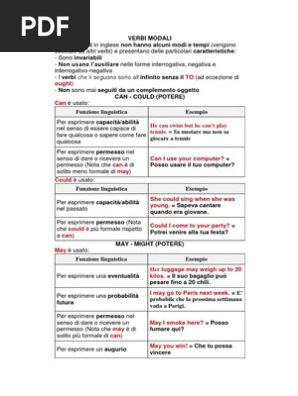 In inglese esistono otto tipi di verbi modali principali, i primi quattro sono can, could, may e might • Can viene usato per esprimere il concetto di abilità, capacità e opportunitàNella forma interrogativa viene utilizzato per chiedere il permesso e fare richieste. Leggi gli appunti su verbimodali qui Gli appunti dalle medie, alle superiori e l'università sul motore di ricerca appunti di Skuolanet. I verbi modali in inglese non hanno alcuni modi e tempi (vengono sostituiti da altri verbi) e presentano delle particolari caratteristiche • Sono invariabili • Non usano l’ausiliare nelle forme interrogativa, negativa e interrogativonegativa • I verbi che li seguono sono all’infinito senza il to (ad eccezione di ought).