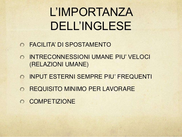 Presentazione corso di lingua inglese per bambini 1 corso di inglese imparare giocando 2 l’importanza dell’inglese facilita’ di spostamento intreconnessioni umane piu’ veloci (relazioni umane) input esterni sempre piu’ frequenti requisito minimo per lavorare competizione 3. Se non sai da che parte iniziare, con questo articolo avrai tutte le informazioni necessarie per fare un'ottima presentazione in inglese!. 4 ANNI – Avvicinare i bambini alla scoperta di una nuova lingua, l’ INGLESE (diversa da quella madre), interiorizzandone le sonorità e sviluppando un lessico base, scoprendo e sperimentando attraverso il gioco 5 ANNI – Recuperare, arricchire ed approfondire la conoscenza della lingua inglese, sempre attraverso il gioco, creando un legame tra la scuola dell’infanzia e la scuola primaria.