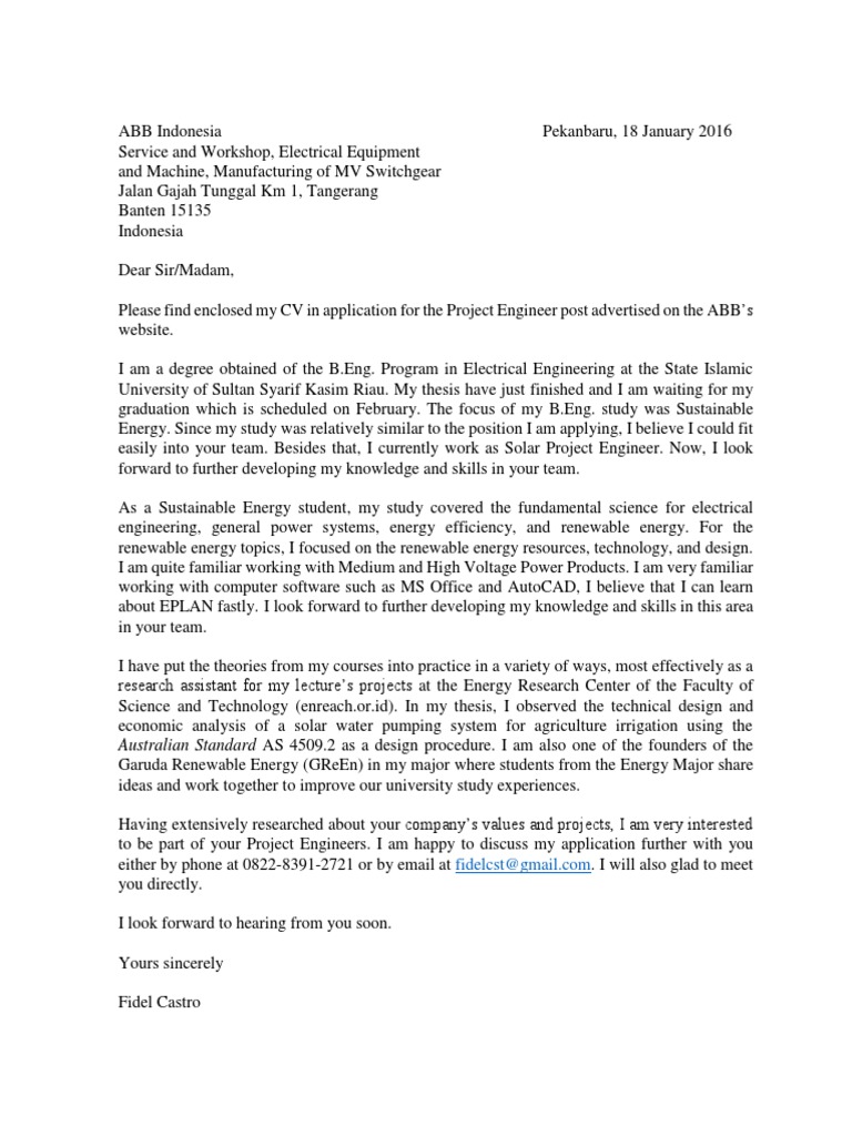 Project Engineer cover letter example 2 Christine Graham Hiring Manager Dayjob Ltd 1 Vyse Street Birmingham B18 6NF 14 th August 19 Dear Ms Graham, Whilst browsing the job adverts on the Dayjobcom website, I came across your vacancy for a Project Engineer After reading the job description, I quickly realised it was an exact match for. Customize this Letter There are plenty of opportunities to land a Construction Project Engineer position but it won’t just be handed to you Crafting a Construction Project Engineer cover letter that catches the attention of hiring managers is paramount to getting the job and LiveCareer is here to help you stand out from the competition. This is Rendy, a passionate Egyptian Electrical Engineer who has been working as a Solar PV Project Engineer in Riyadh, Saudi Arabia, for the last 4 years I would like to pursue my ultimate passion towards renewable energy and hopefully join a dedicated Solar PV company as Solar PV Engineer with a technical, sales or business development role.