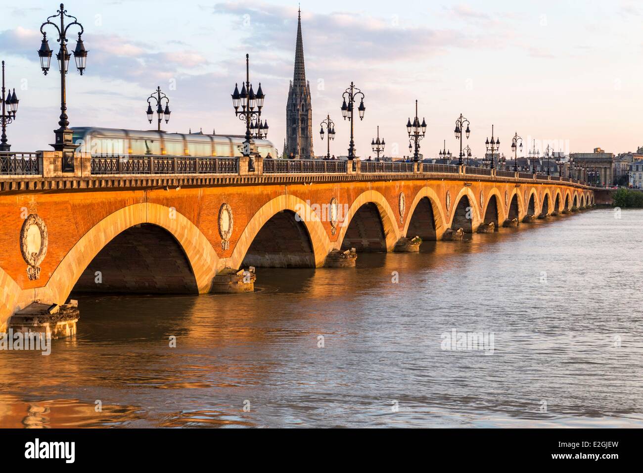 Francia Gironde Bordeaux Tram Sul Ponte Di Pietra Attraversando Garonne Costruita Su Ordini Di Napoleone Tra Il 1810 E Il 12 E Stato Progettato Da Claude Deschamps E Jean Baptiste Basilide Billaudel Ingegneri
