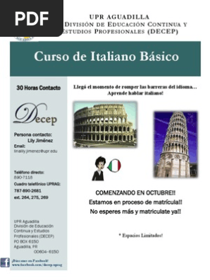 A letra sublinhada indica a posição do acento que em italiano não se escreve nestas palavras fica só nos casos nos que o acento pode emprestarse a confusão Disposta especial atenção a esdrújula da terceira plural Verbos da segunda conjugação o infinitivo termina em "ere" , como por exemplo. 5 manuales para aprender italiano en PDF (para principiantes) #1 Libro “Gramática Italiana” en PDF En este breve PDF de 25 páginas podrás acceder a las principales palabras en #2 Libro “Curso de Gramática Italiana” en PDF Este PDF de 32 páginas es otra alternativa para familiarizarte con la. Milagros me encanta el idioma italiano () Andrés la verdad he disfrutado mucho de este curso y pienso seguir estudiando los demas cursos de Italiano para poder intentar dominar el idioma pues me interesa mucho no solo hablarlo sino tambien dominarlo ().