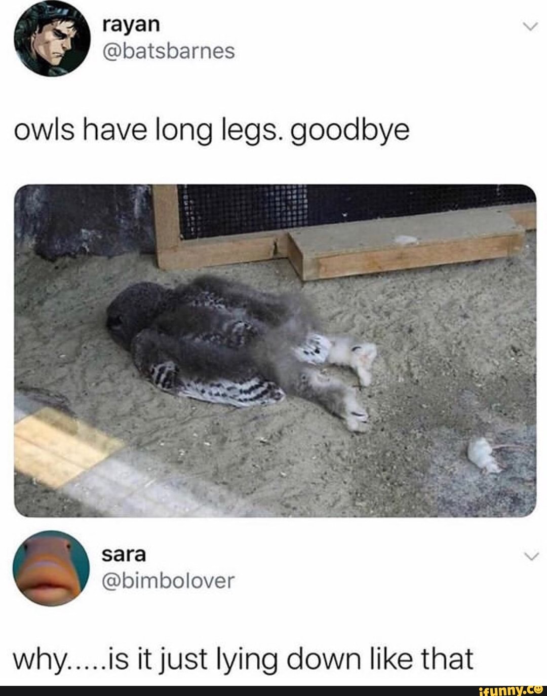 Owls Have Long Legs Goodbye Tam Is It Just Lying Down Like That Ifunny