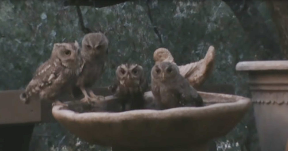 Sweet Family Of Screech Owls Enjoys A Moment Of Serenity In A Backyard Birdbath
