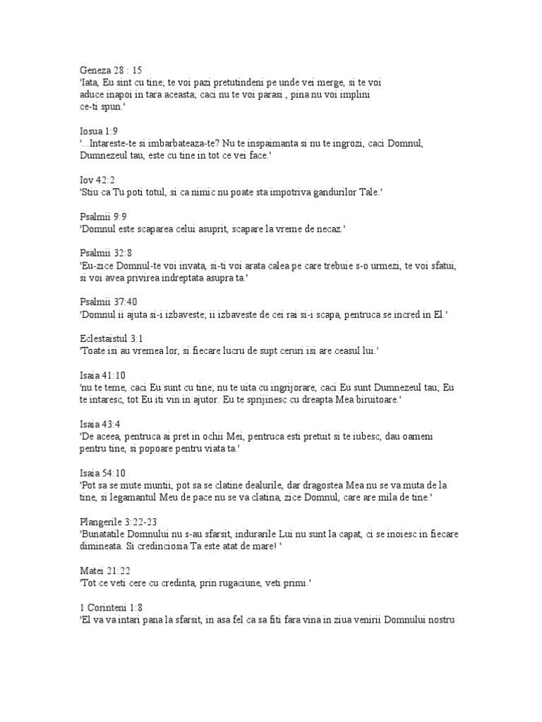 Dec 10, 15Miam dat seama cât de goale sunt cuvintele mele pentru a răspunde unei asemenea nevoi Așa că am apelat la Cuvânt Și cred că El are o soluție, are o făgăduință pentru orice situație, oricât de dureroasă Mai jos sunt 25 de pasaje, de la Geneza la Apocalipsa, prin care Domnul ne oferă soluția Sa la problema suferinței. VERSETE BIBLICE DE NCURAJARE ENGLISH Ieremia Căci Eu ştiu gândurile pe care le am cu privire la voi, zice Domnul, gânduri de pace, şi nu de nenorocire, ca să vă dau un viitor şi o nădejde Voi Mă veţi chema şi veţi pleca;. Versete relevante pentru subiectul Judecata de apoi Evrei 927 4 / 0 tot așa, Cristos, după ce Sa adus jertfă o singură dată, ca să poarte păcatele multora, Se va arăta a doua oară nu în vederea păcatului, ci ca să aducă mântuirea celor ceL așteaptă.