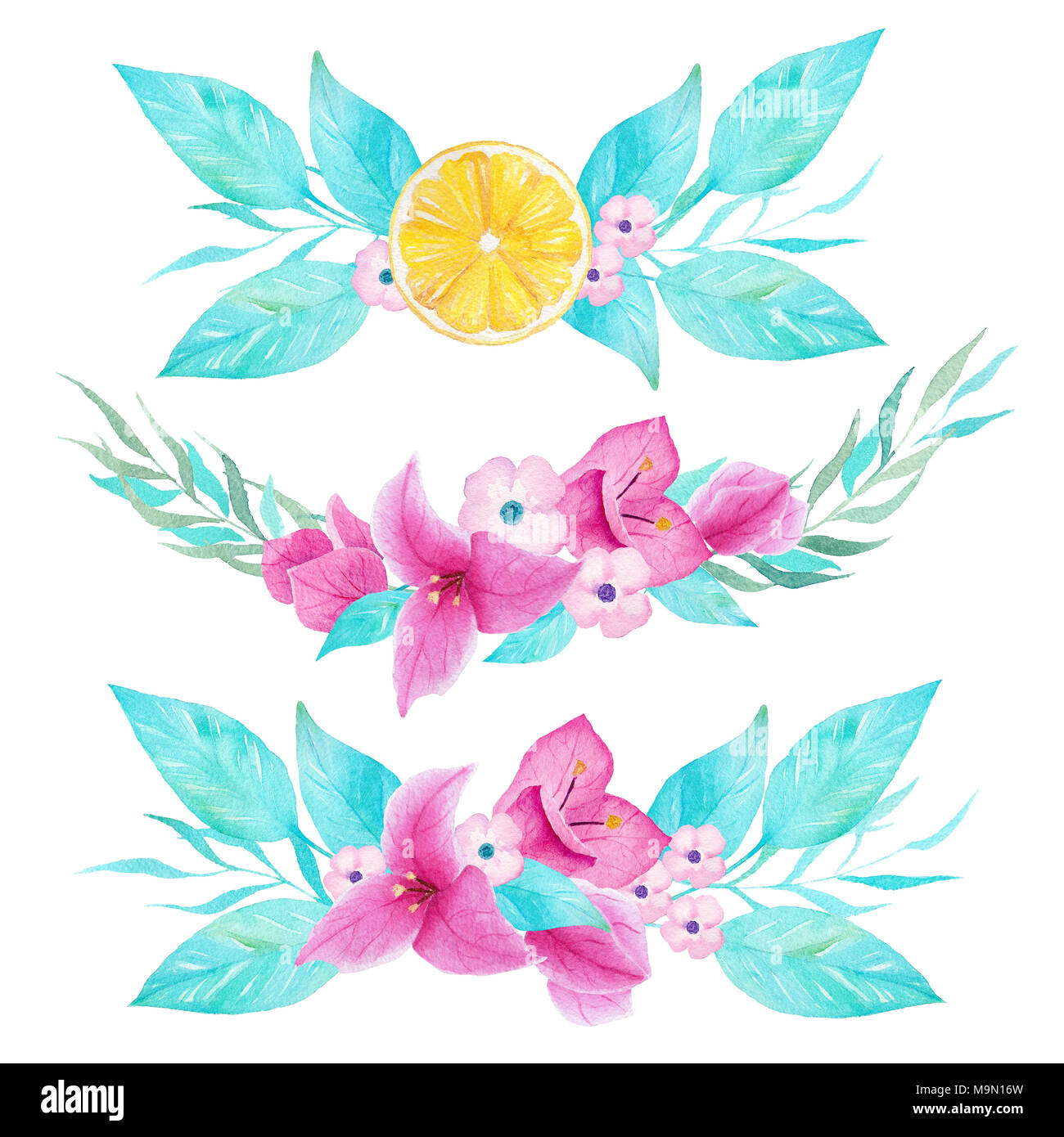 Acquarello Dipinto A Mano La Decorazione Floreale Con Limone E Fiori Di Bouganvillea Su Sfondo Bianco Puo Essere Utilizzato Per La Stampa E La Decorazione Foto Stock Alamy