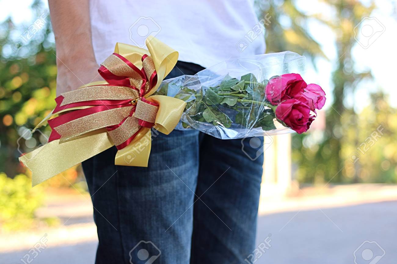 Immagini Stock Un Bel Mazzo Di Rose Rosse Con Il Nastro E Tenuto Da Giovane Con Camicia Bianca Su Sfondo Sfocato Di Natura Concetto Di Amante E Incontri O San Valentino