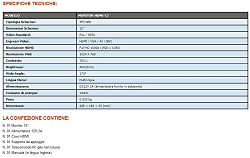 Monitor 12 Pollici Full 1080p Colori Av Vga Hdmi Bnc Videosorveglianza Video Pc Elettronica Monitor