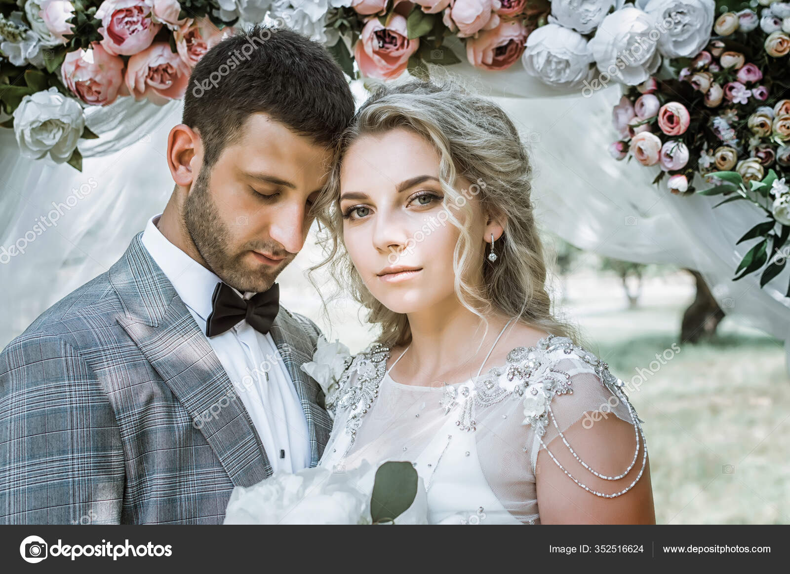 Bride Groom Embrace Wedding Arch Wedding Day Selective Focus Film Stock Photo C Studeg Mail Ru