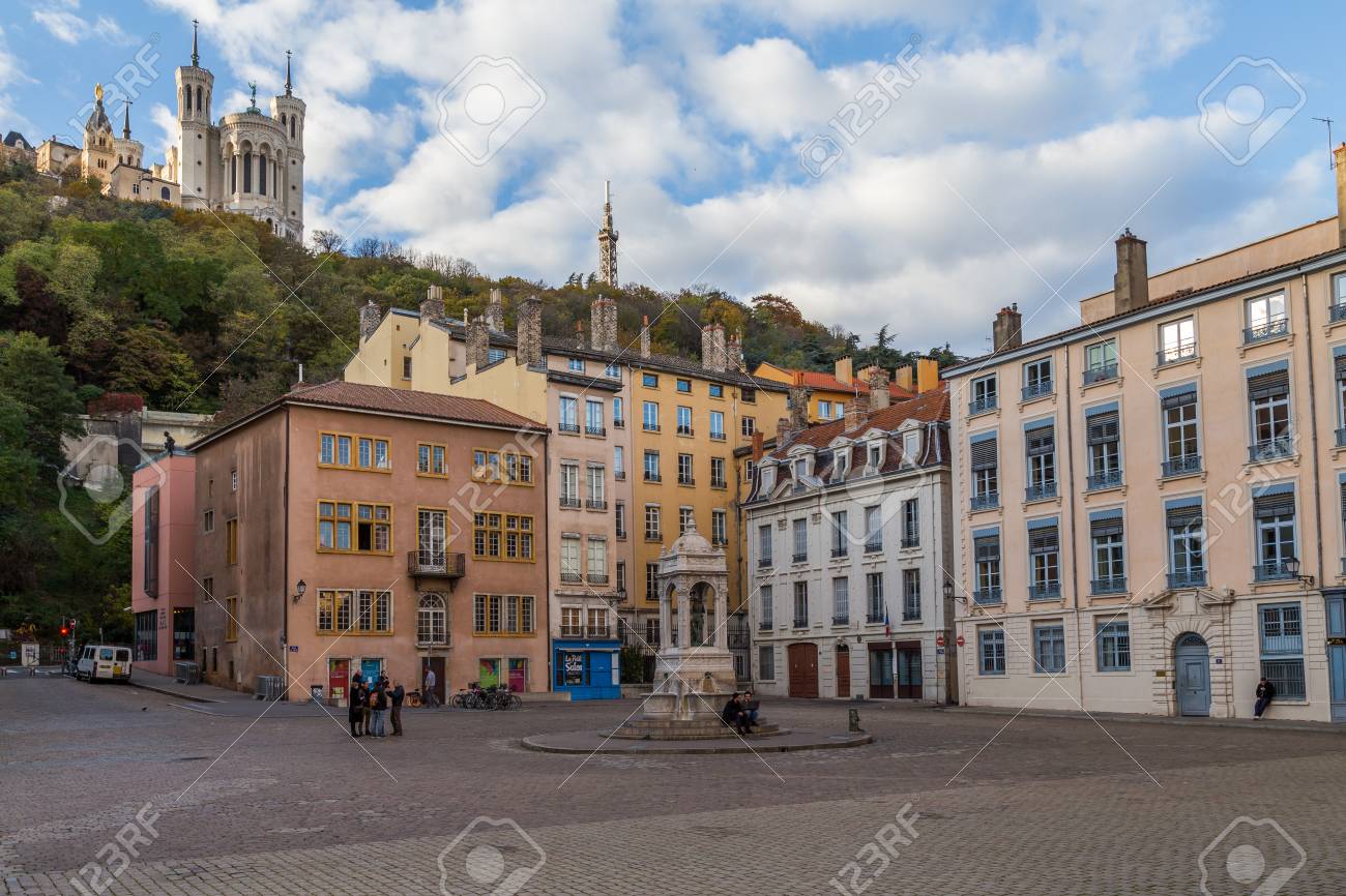 Immagini Stock Scena Di Strada Nella Piazza Della Citta Vecchia Di Lione Con Vista Su La Basilique Notre Dame De Fourvia Re Image