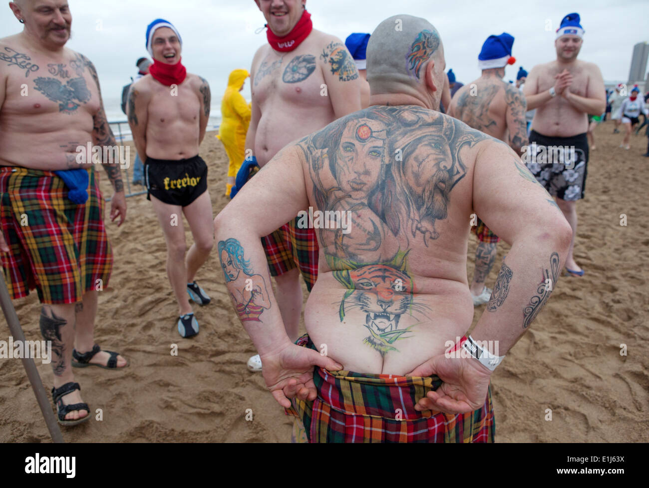 Tattooed Men On Beach For Polar Bear Club New Years Day Plunge Stock Photo Alamy