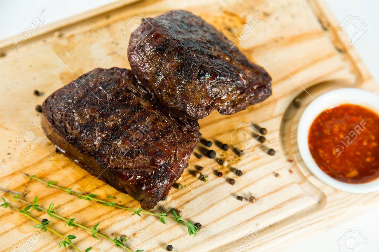 Beautiful Juicy Well Done Steak With Sauce On A Wooden Board Stock Photo Picture And Royalty Free Image Image