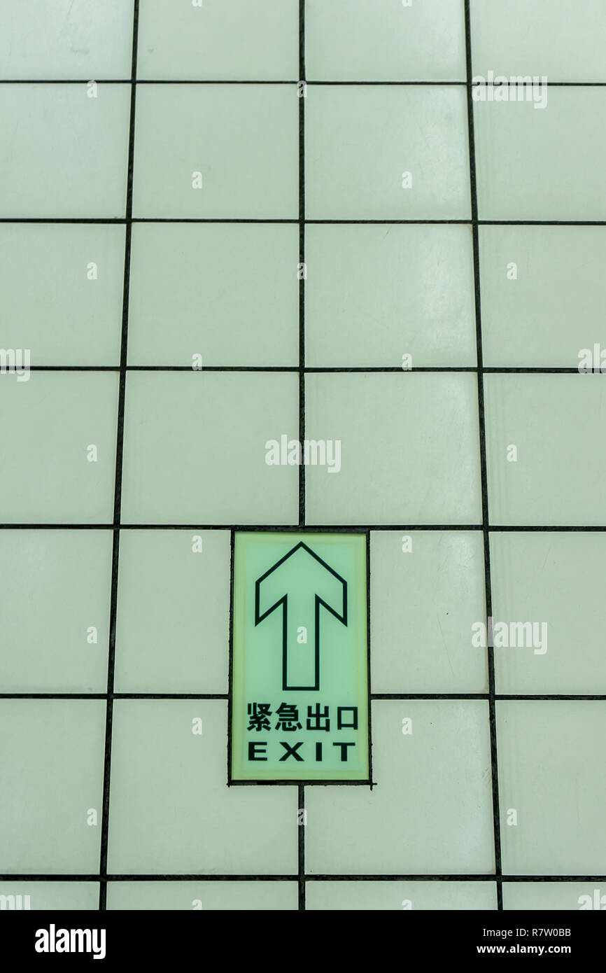 Colore Verde Scuro Segno Di Freccia In Inglese E In Cinese Sul Pavimento In Piastrelle Foto Stock Alamy