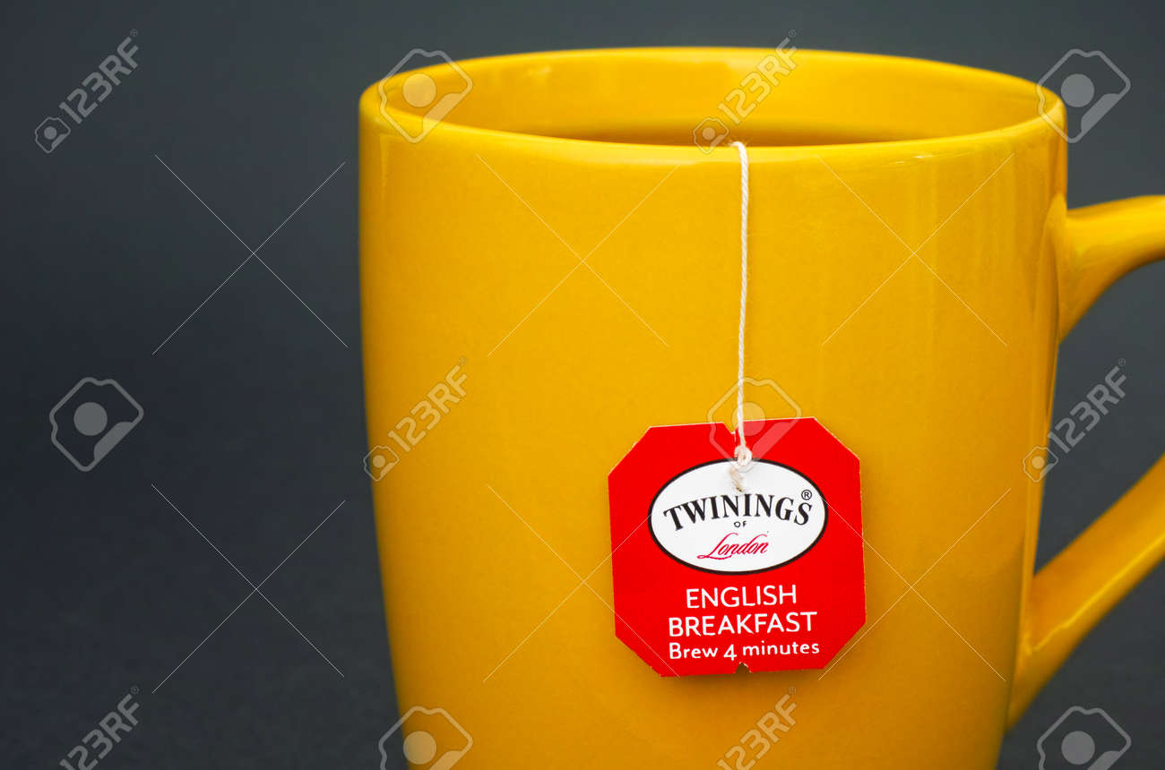 Immagini Stock Tambov Federazione Russa 28 Agosto 17 Tazza Di Te Inglese Colazione Twinings Sfondo Verde Scuro Studio Girato Image