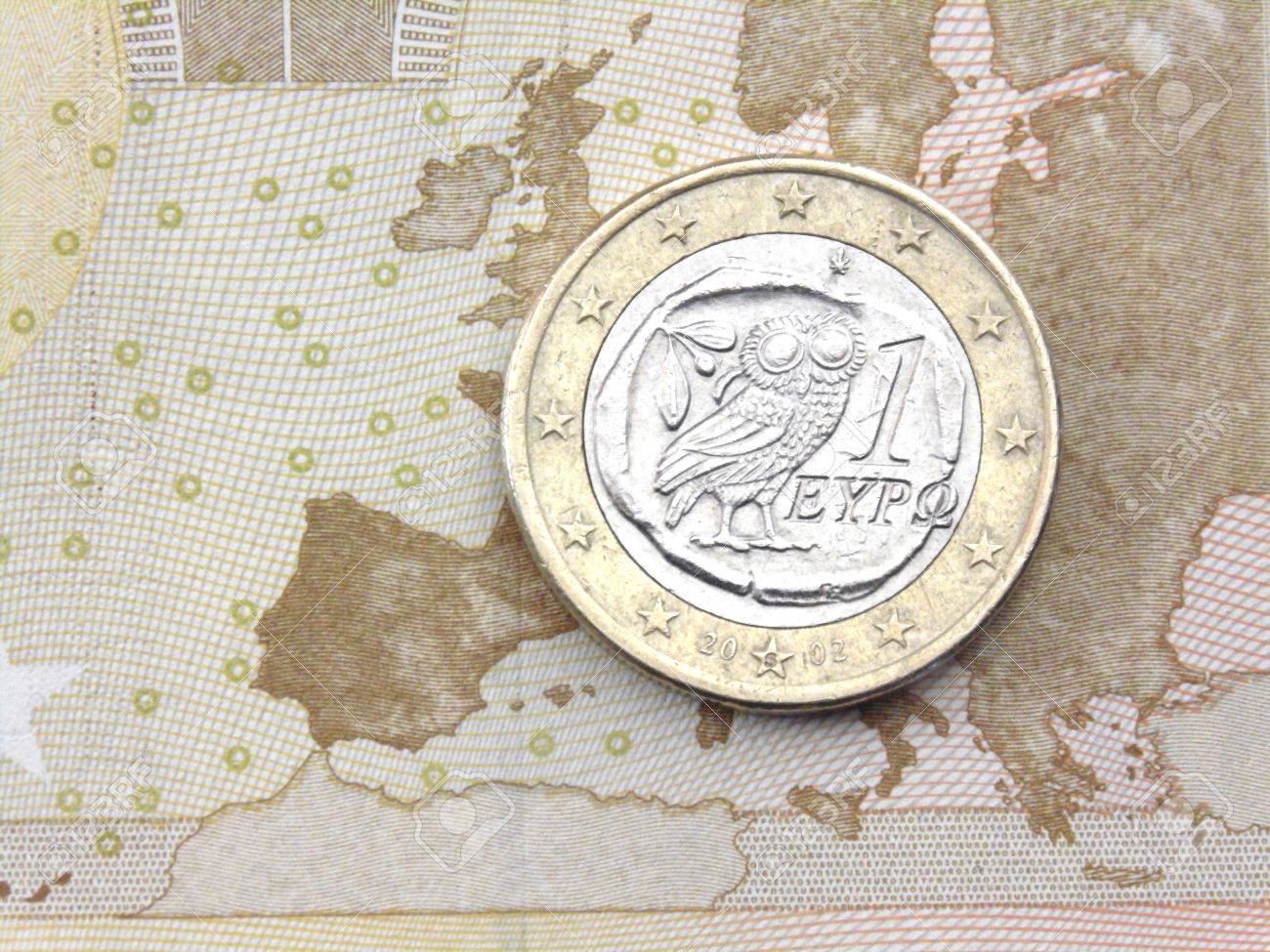 Immagini Stock Euro Moneta Greca Una Moneta Greca Euro E Sulla Mappa D Europa Su Una Banconota Da 50 Euro Image