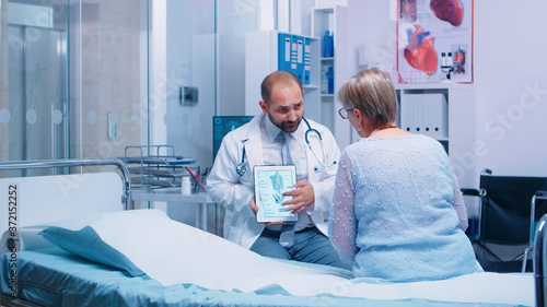 Experienced Doctor Explaining Marble Bone Disease To Senior Elder Woman Patient Sitting On Hospital Bed In Private Clinic Medical Services Medicine Healthcare Well Being Support Physician Working Buy This Stock Photo And