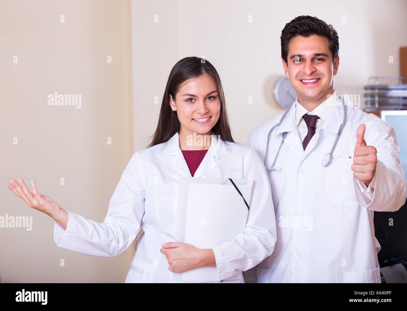 Portrait Of Smiling Doctor And His Young Assistant In Private Clinic Stock Photo Alamy