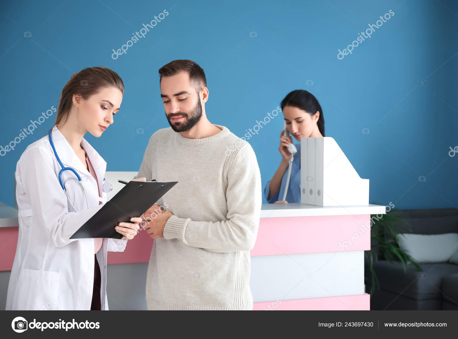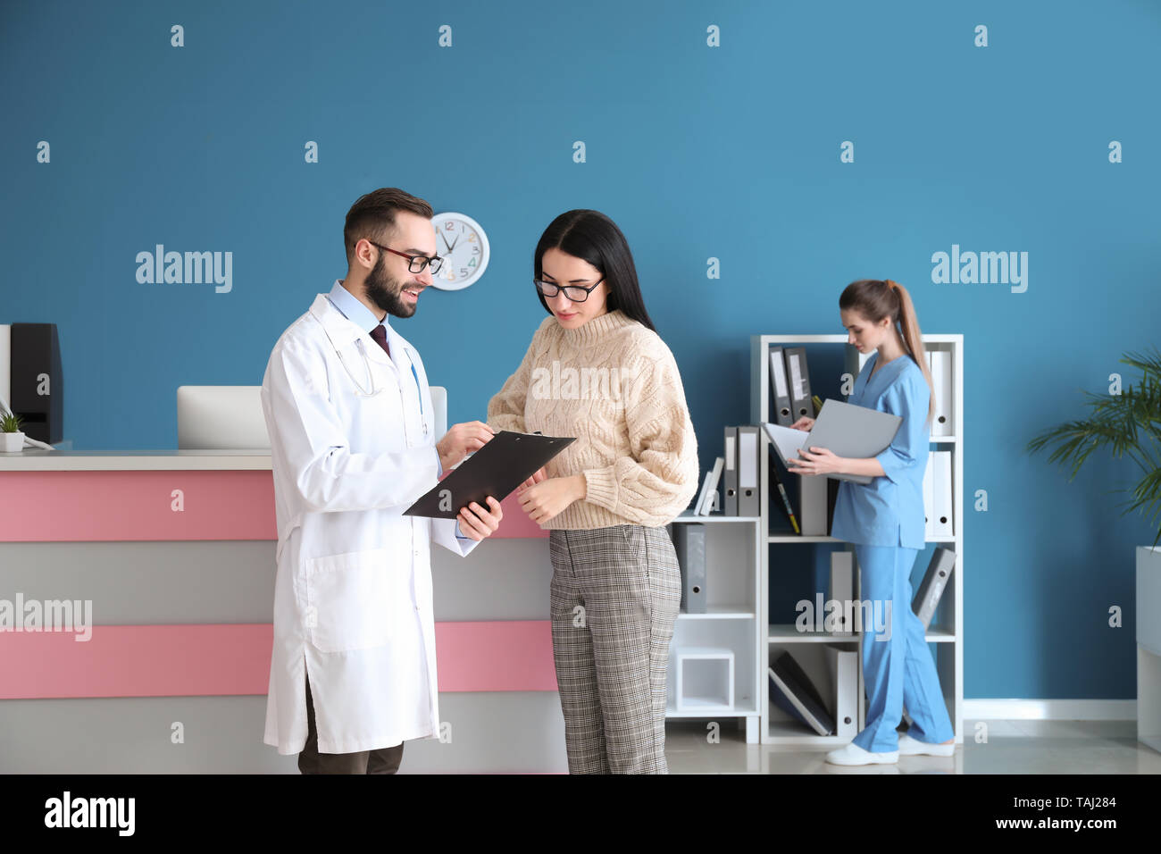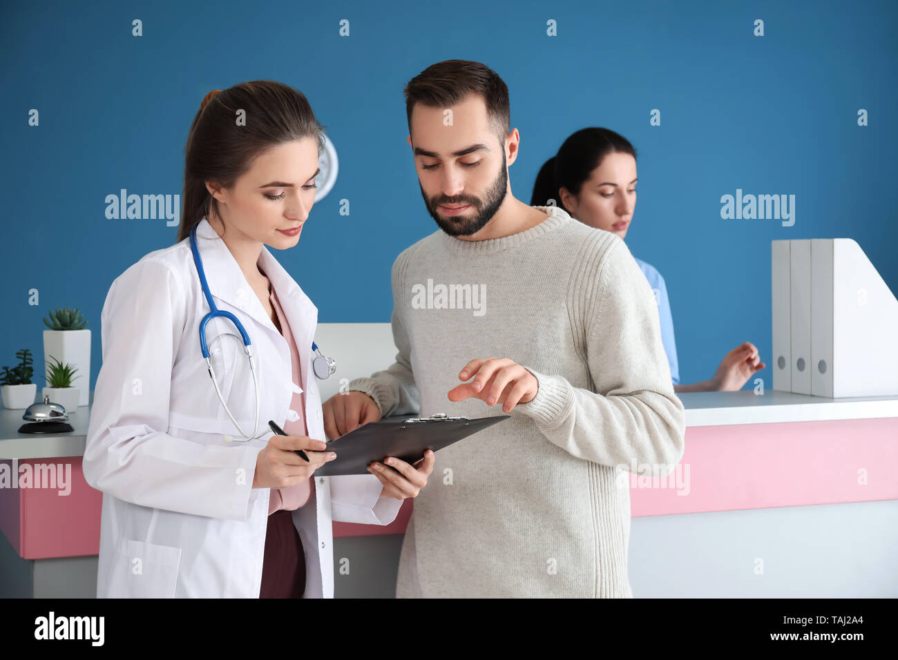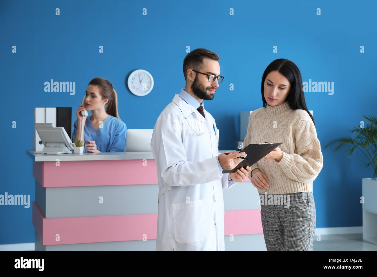 Make And Female Doctor At Reception In A Modern Private Clinic Stock Photo Alamy