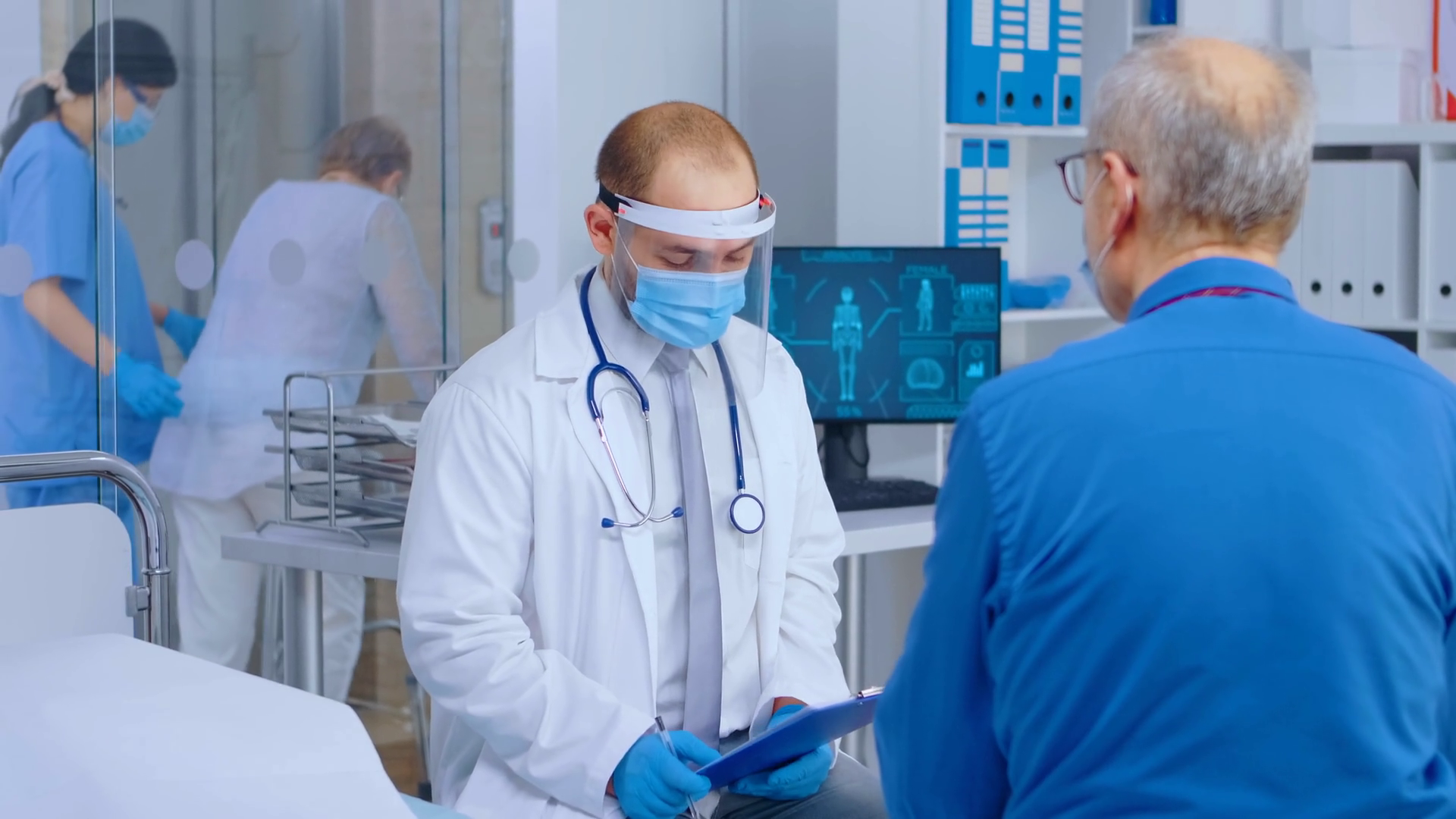 Doctor With Protective Wear Consulting Senior Patient During Covid 19 Private Modern Hospital Or Clinic Medical Healthcare Appointment Coronavirus Outbreak Virus Protection Stock Video Footage Storyblocks