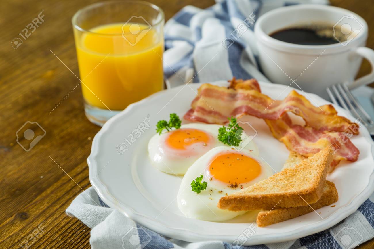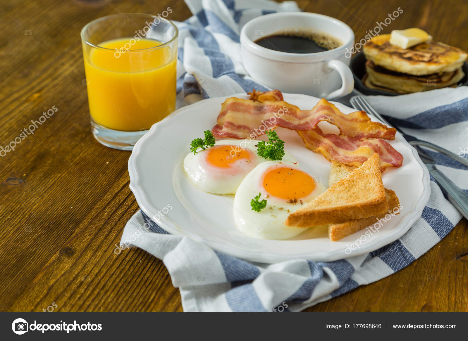Immagini Stock La Prima Colazione Americana Con Sole Uova Laterali Up Pancetta Toast Pancake Caffe E Succo Di Frutta Sfondo Di Legno Image