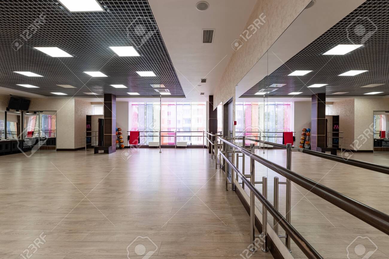 Group Fitness Room Modern Interior Design Fitness Workout Fitness Gym Background Gym Equipment Background Empty Space Large And Light Hall With Mirrors Music Equipment For Dancing Sports Stock Photo C R4films