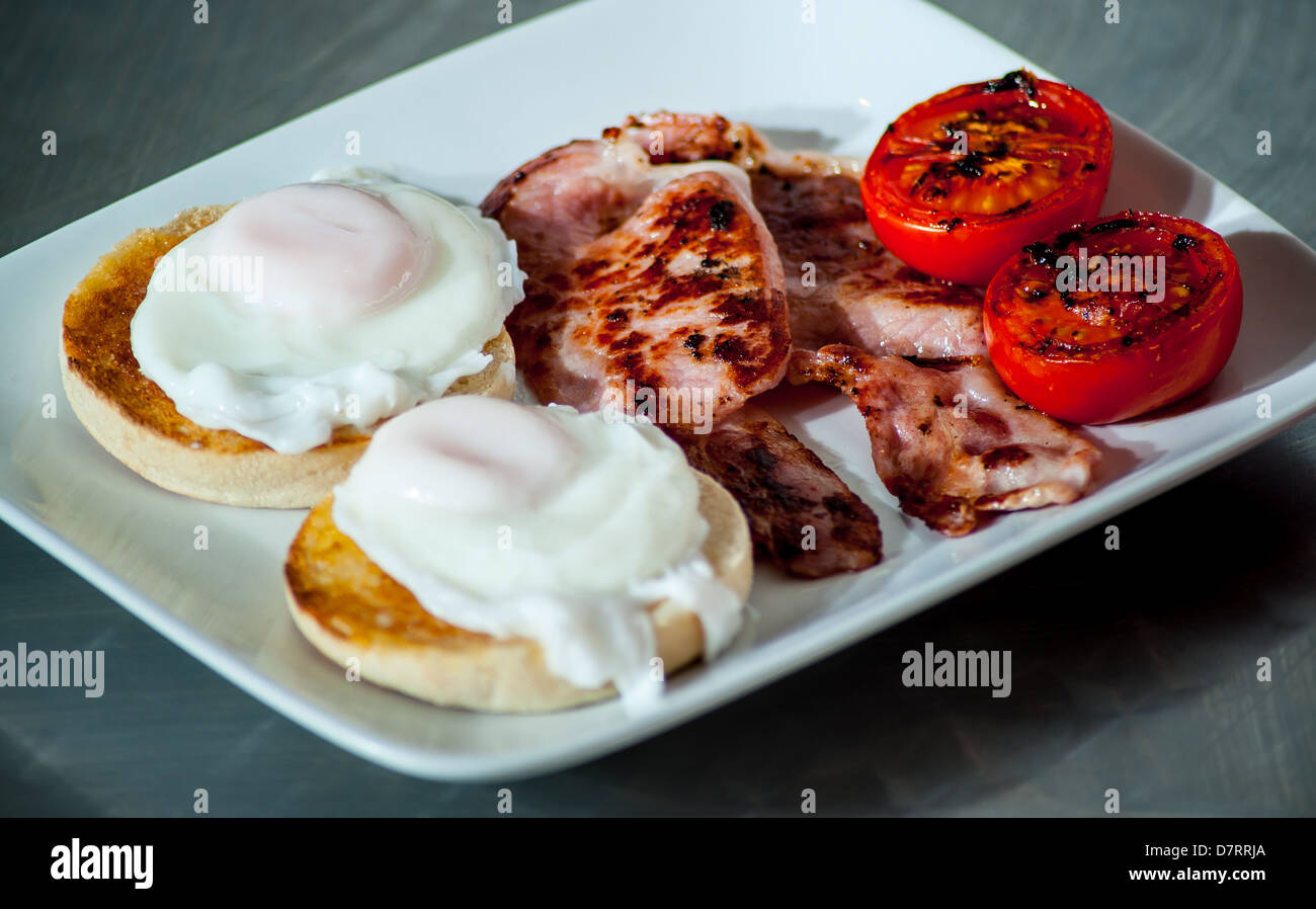 Una Sana Prima Colazione Inglese 2 Uova In Camicia Su Muffin Con Bacon Arrosto E 2 Pomodoro Grigliate In Un Bar Chiamato Impennare Regno Unito Foto Stock Alamy