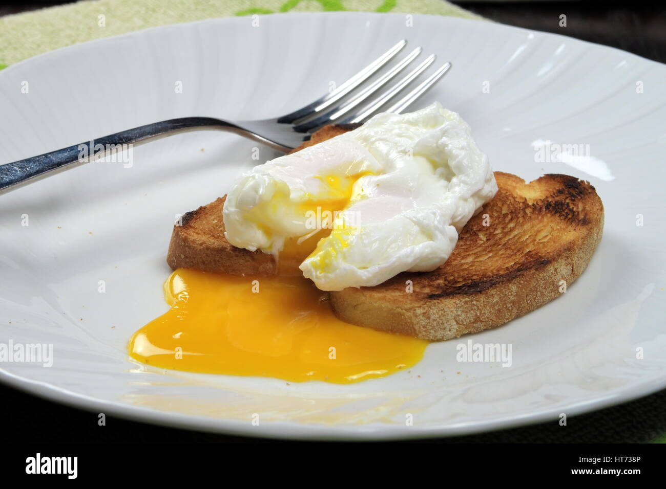 Uovo In Camicia Su Toast Con Naso Che Cola Di Tuorlo Giallo E La Forcella E Servita In Un Piatto Bianco Classico Inglese Completa Prima Colazione Tipica Di Regno Unito E