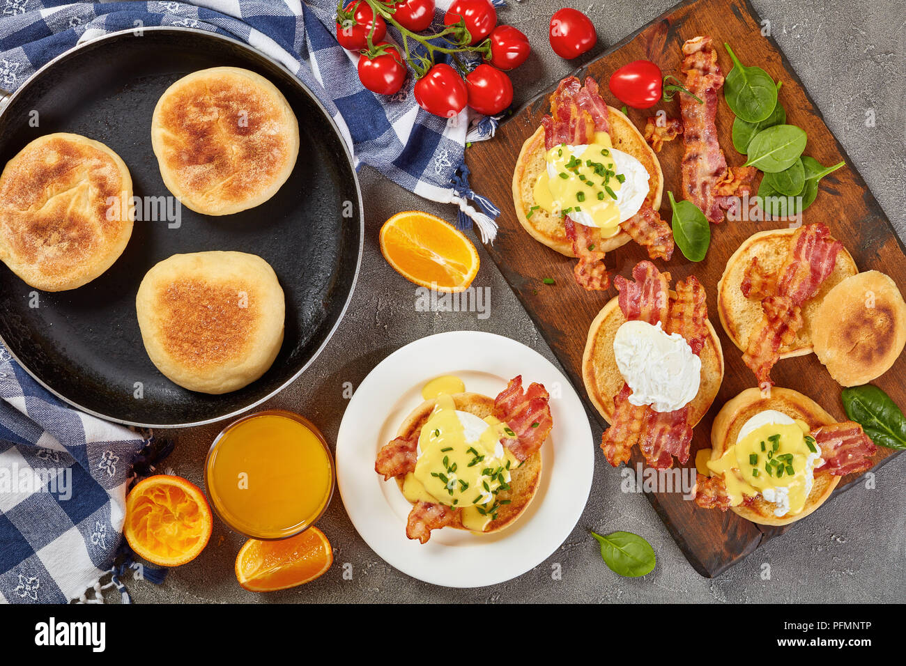 Uova Benedict Tostato Muffin Inglese Fritto Croccante Di Pancetta Uova In Camicia E Burrosa Classica Salsa Olandese Servito Con Succo D Arancia A Colazione Foto Stock Alamy