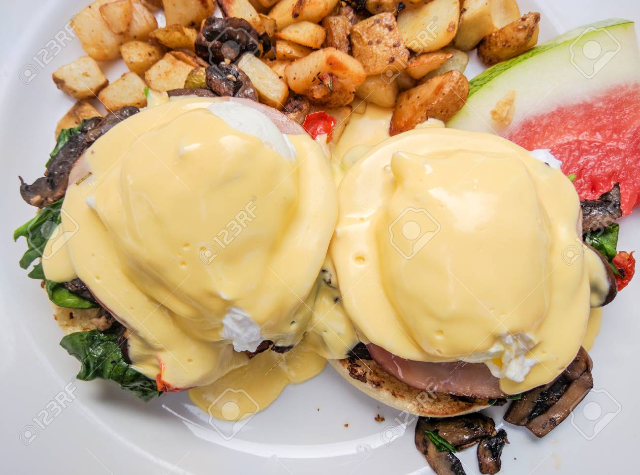 Immagini Stock Eggs Benedict E Un Tradizionale Brunch Americano O Piatto Da Colazione Composto Da Due Meta Di Un Muffin Inglese Ciascuna Delle Quali E Guarnita Con Pancetta Uovo In Camicia