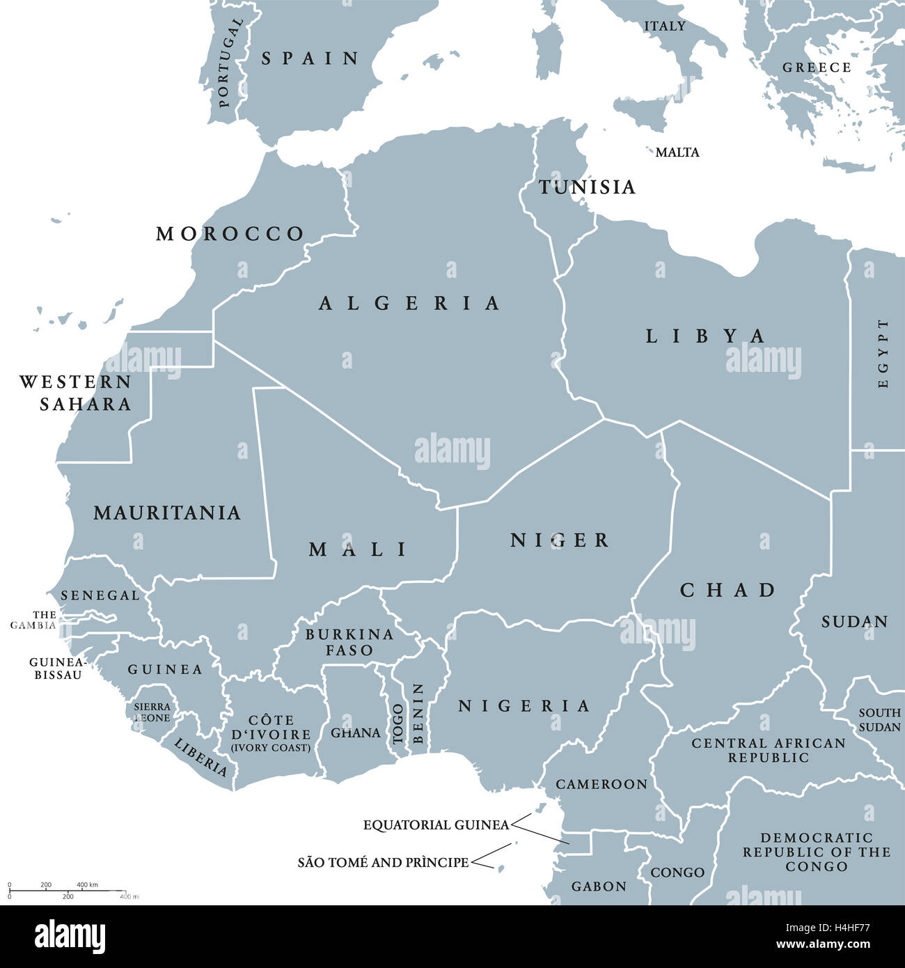 Africa Occidentale Paesi Mappa Politico Con I Confini Nazionali Paese Di Lingua Inglese Nomi Illustrazione Illustrazione Di Grigio Foto Stock Alamy