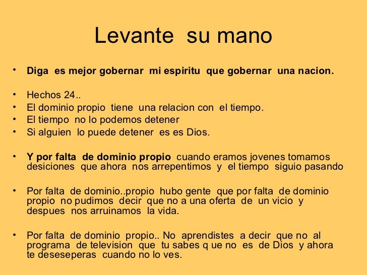 Versículos de la Biblia sobre el Autocontrol Como ciudad sin defensa y sin murallas es quien no sabe dominarse Pues Dios no nos ha dado un espíritu de timidez, sino de Más vale ser paciente que valiente;. Dominio propio « dominio propio» (Gálatas 523) Es uno de los frutos que genera el Espíritu en nosotros Dominio significa autoridad, poder, potestad Propio que nos pertenece En pocas palabras, el dominio propio es la capacidad en nosotros para ejercer control a nuestro temperamento y carácter Lo que es nacido de carne, carne es. ¿Consiste en capacitarlo para la vida y sus deberes, en calificarlo para ocupar una posición honrosa en el mundo, para hacer el bien, para beneficiar a sus semejantes, y para ganar alguna vez la recompensa de los justos?.