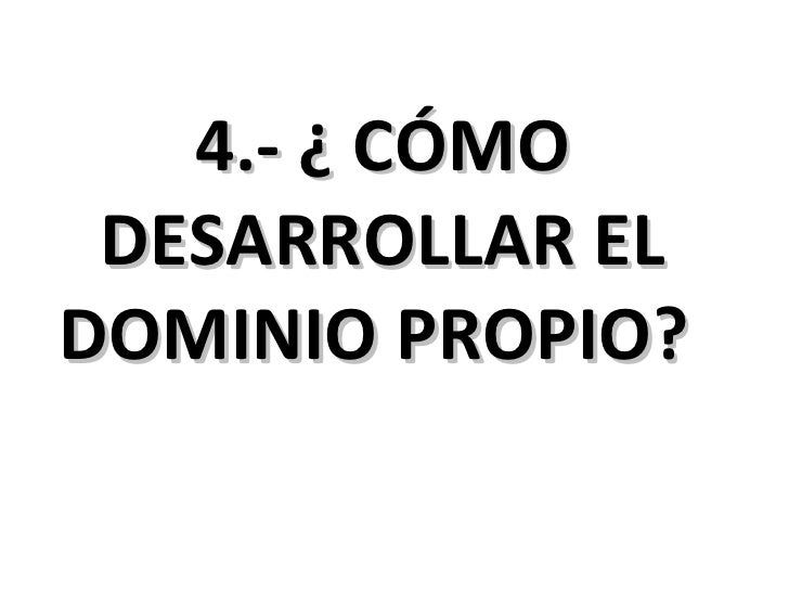 Esto no hubiera sido posible si Pancholos no contara con una pagina web y nombre de dominio propio wipoint It would not have been possible, however, if Pancholos had not had its own website and domain name any consumer can enter the name in a search engine, find the page and place an order. Dominio propio, es controlar nuestras emociones y que no las emociones nos controlen a nosotros Niños, ¿qué les parece si pegamos los frutos que aprendimos el día de hoy y los pegamos en nuestra cartulina de los frutos del espíritu?. Capítulo 4 Dominio propio o autocontrol OBJETIVO Enseñar y orientar a los jóvenes en la adquisición del dominio propio como una de las mayores virtudes del carácter y la personalidad FUNDAMENTACIÓN (Del lat temperanta) fModeración, sobriedad y continencia Rel Una de las cuatro virtudes cardinales, que consiste en moderar los apetitos y el uso excesivo de los sentidos.
