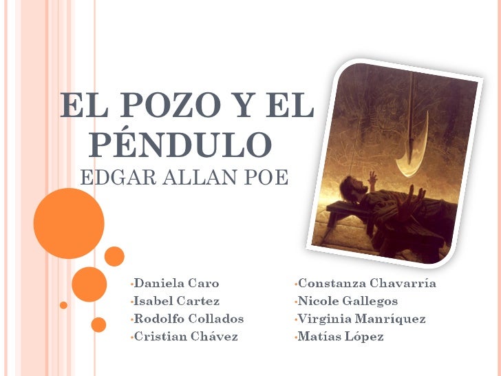 El modo y la hora eran todo lo que me ocupaba y me atormentaba el momento en que caí, contaba ya cincuenta y dos pasos, y al emprender nuevamente el paseo, conté cuarenta y ocho más, cuando encontré. El Pozo y el Péndulo de Edgar Allan Poe para Sexto Grado de Primaria Aquí encontraras la ficha de El Pozo y el Péndulo de Edgar Allan Poe preparado para niños de Sexto Grado de Primaria o que tengan entre 11 y 12años de edad, este tema corresponde al curso de Literatura. El pozo y el péndulo Crítica feroz la mayoría de las veces indulgente sobre la actualidad musical, literaria y artística Perfiles literarios Vidas y palabras Buscar Buscar este blog Entradas AMPULOSA CLAUSURA septiembre 01, Crítica FIS Música Obtener enlace;.