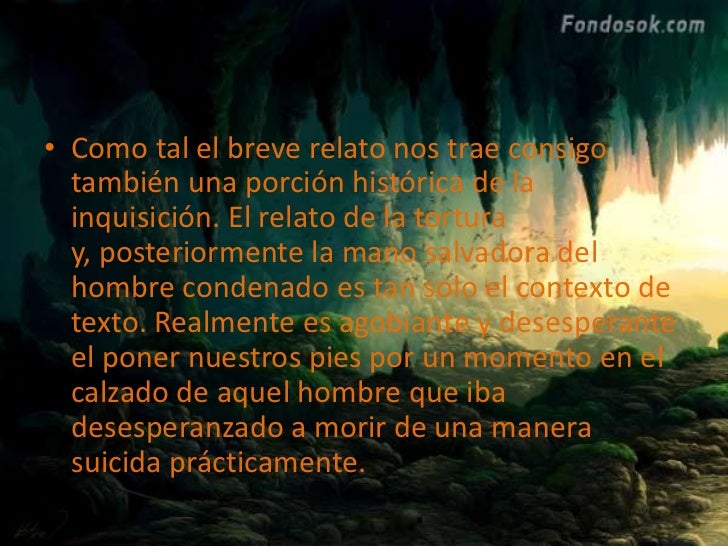 Si el entierro prematuro era claustrofobico, el pozo y el péndulo da un paso más allá, torquemada y el autor hubieran pasado tardes memorables creando instrumentos de tortura Cuento de manual, donde ni falta ni sobra, simplemente se sufre pues su prosa tiene entre otras, lq virtud de poner a personaje y lector a dos milímetros de distancia. El pozo, sí, cuyos horrores estaban destinados a un recusante tan obstinado como yo;. El protagonista es sentenciado a la muerte por monjes debido a la Inquisición en Toledo El hombre aparece en una sala oscura, el da 10 o 12 pasos cuando el se cae, y empieza a tocar con sus manos el piso, es así cuando se da cuenta que en dos o tres pasos mas empieza un pozo.