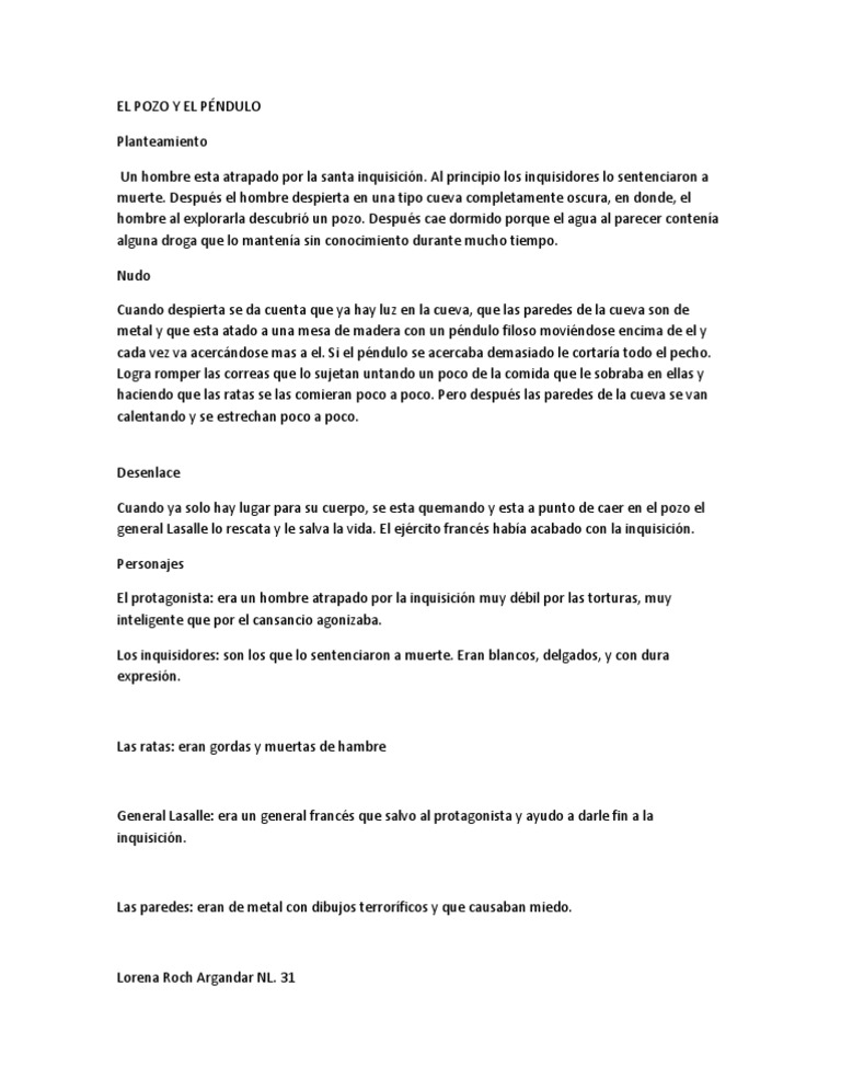 Hoy es el turno de que analicemos el cuento El pozo y el péndulo uno de los textos más conocidos del escritor estadounidense Edgar Allan PoeEl pozo y el péndulo es relato estremecedor que apenas deja respirar al lector mientras lo atrapa en la piel del protagonista un hombre sentenciado a muerte. En “El pozo y el péndulo” al narrador se le presentan tres pruebas a muerte que debe superar Primero sobrevive la prueba del pozo, gracias a que la fortuna no lo deja caer en él Luego sobrevive a la prueba del péndulo, esta vez debido a que consigue aferrarse lo suficiente a sus facultades mentales para idear el plan que lo libra de las ataduras. EL POZO Y EL PENDULO La historia comienza cuando un joven está sentenciado a muerte por una gran multitud de inquisidores este joven estaba muy agotado y tenía muchas náuseas y en esta agonía solo podía ver a los jueces que lo estaban culpando y a toda una multitud reclamando su nombre el con toda esta agonía sentía que todo su cuerpo se debilitaba y de un momento a otro empezó a.