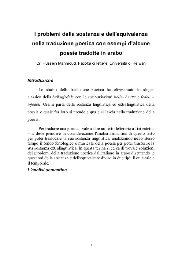 Doc Problemi Di Sostanza E Di Equivalenza Nella Traduzione Poetica Qualche Esempio Di Poesie Tradotte In Arabo Hussein Mahmoud Academia Edu