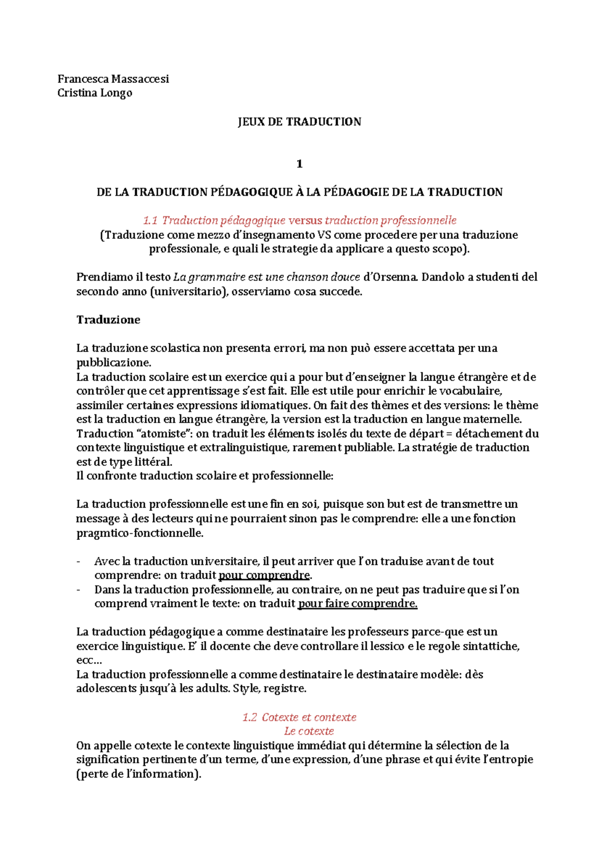 Jeux De Traduction Lingua Francese Francesca Massaccesi Cristina Longo Jeux De Traduction De La Traduction La De La Traduction Traduction Versus Traduction Studocu