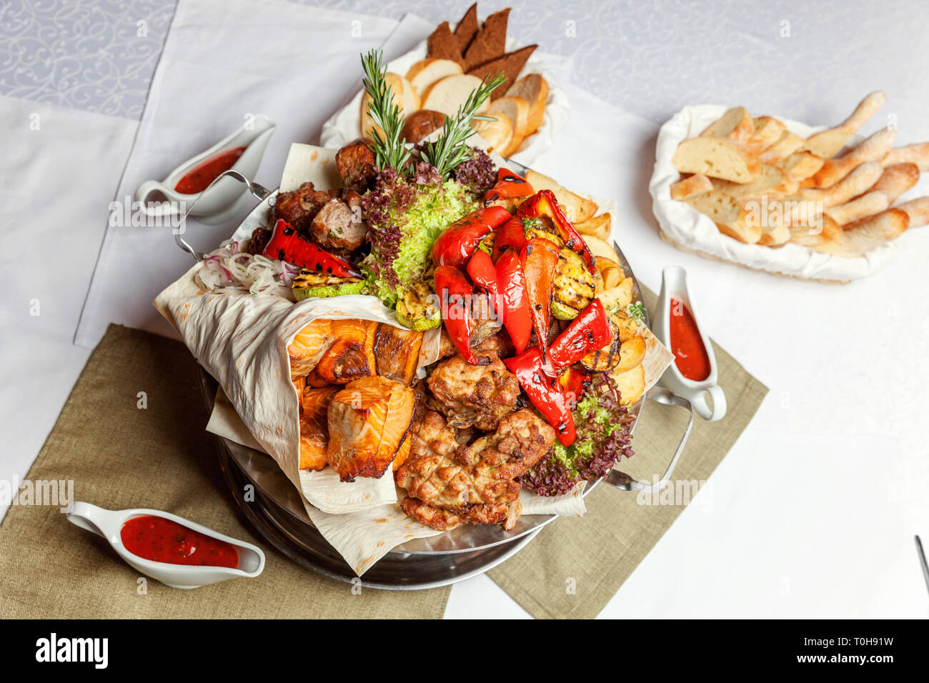 Grigliata Mista Di Carne Verdure Fritte E Salmone Alla Griglia Con I Filetti Di Pesce Decorazione