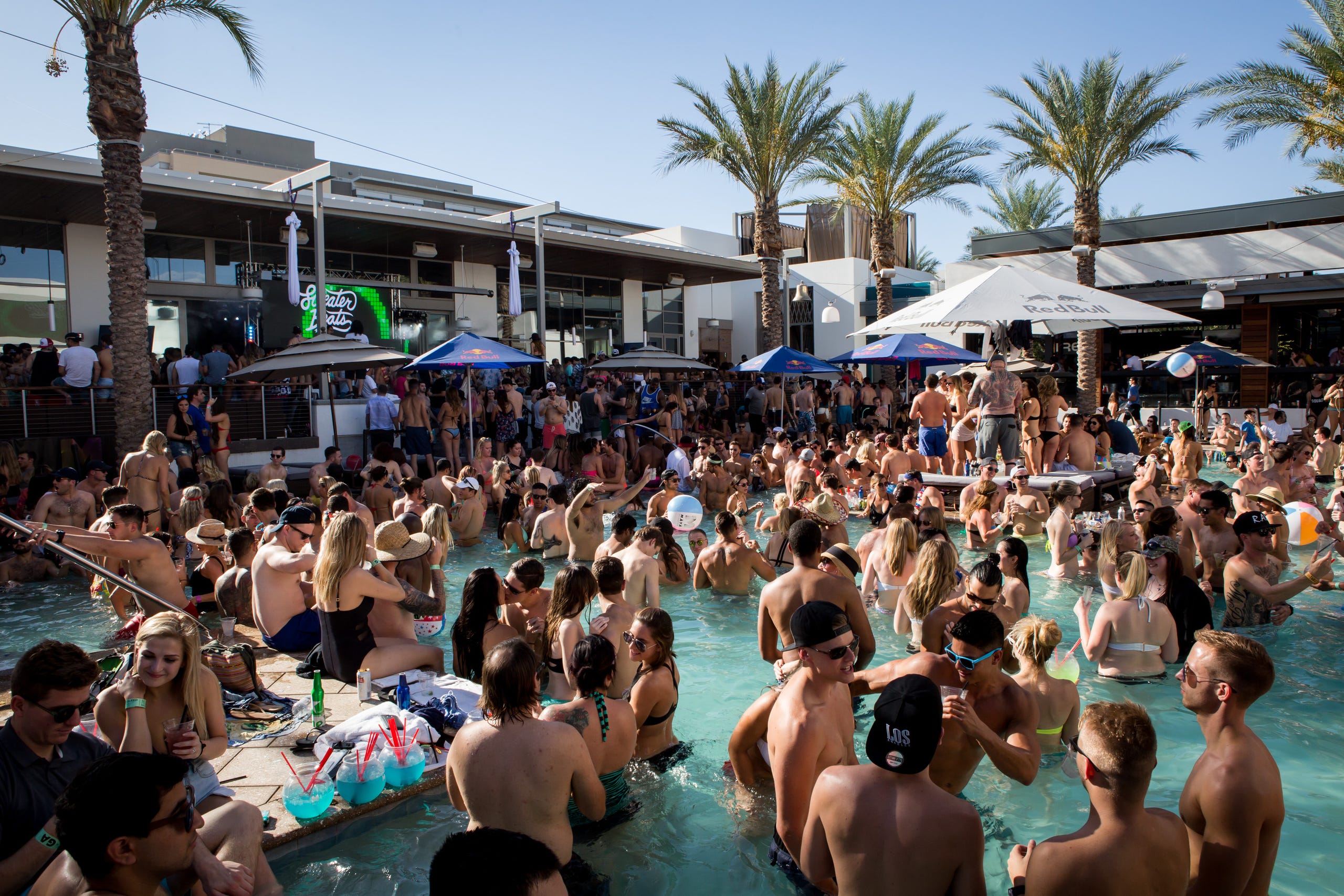 The pool at the day club is fairly small, and on a hot day, there's practically standing room only in the water It gets even more crowded when rappers take to the stage at the lip of the pool Private cabanas with HDTV, XBox, food and drink service, and internet access steps away from the madding crowd can make guests feel like pashas.
