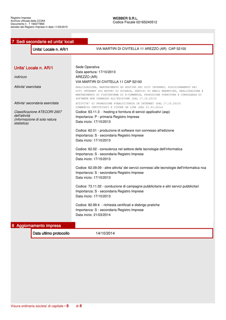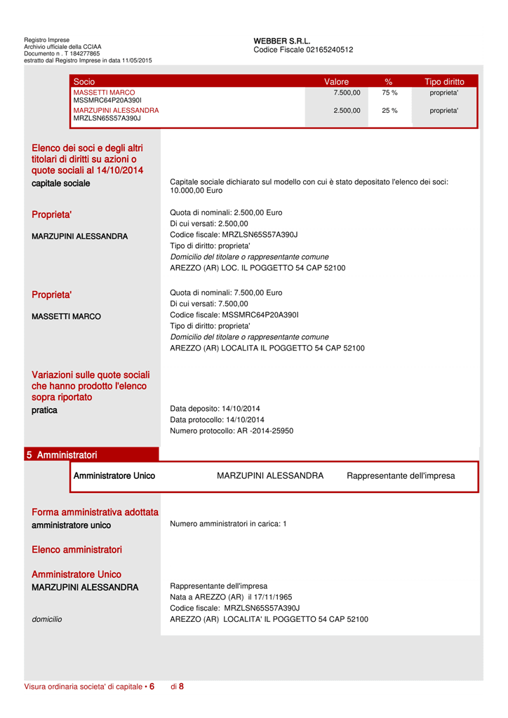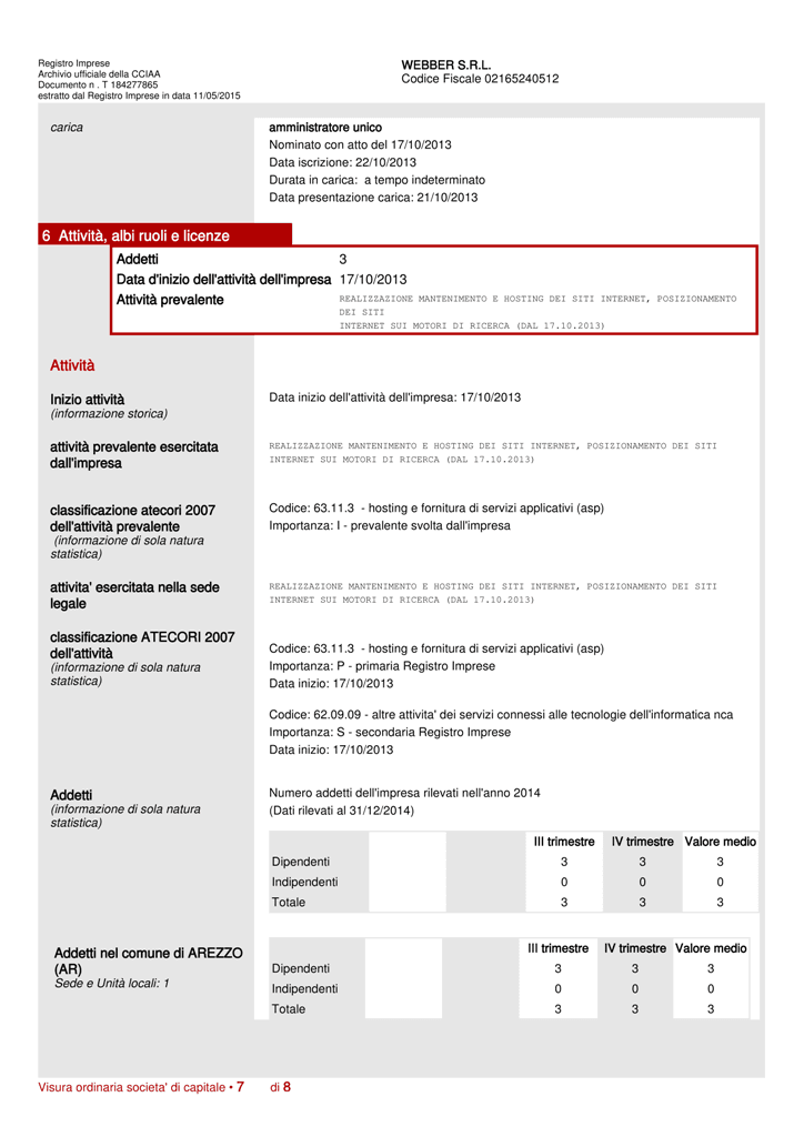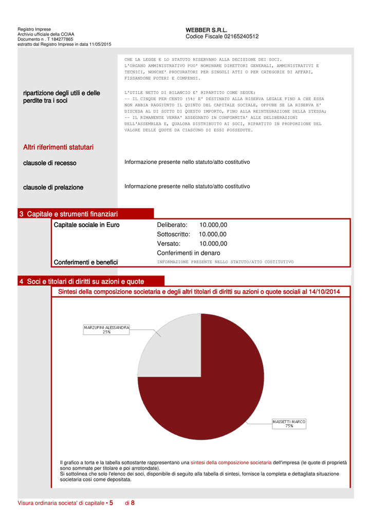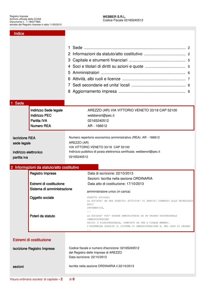 E' possibile acquisire la Visura Camerale Ufficiale e originale della Camera di Commercio, oppure la versione semplice che riporta i dati più importanti ricavati dalla visura stessa Aggiornamento camerale gratuito si attiva alla richiesta del servizio di Visura Camerale e consente di essere aggiornati per 12 mesi circa le segnalazioni di variazione dei dati camerali dell'impresa. Il Certificato camerale viene richiesto in tutti quei casi in cui la semplice visura non è sufficiente (ad esempio, in caso di richiesta di finanziamento, di operazioni societarie, etc) apri la tua attività in 72 ore. Visura camerale ordinaria La visura camerale ordinaria consente di visionare le informazioni che ogni azienda italiana (sia essa individuale che anche capitali come ad esempio la srl o la spa) sono presenti nella banca dati della Camera di Commercio Italiana nella quale sono censite più di di imprese italiane.