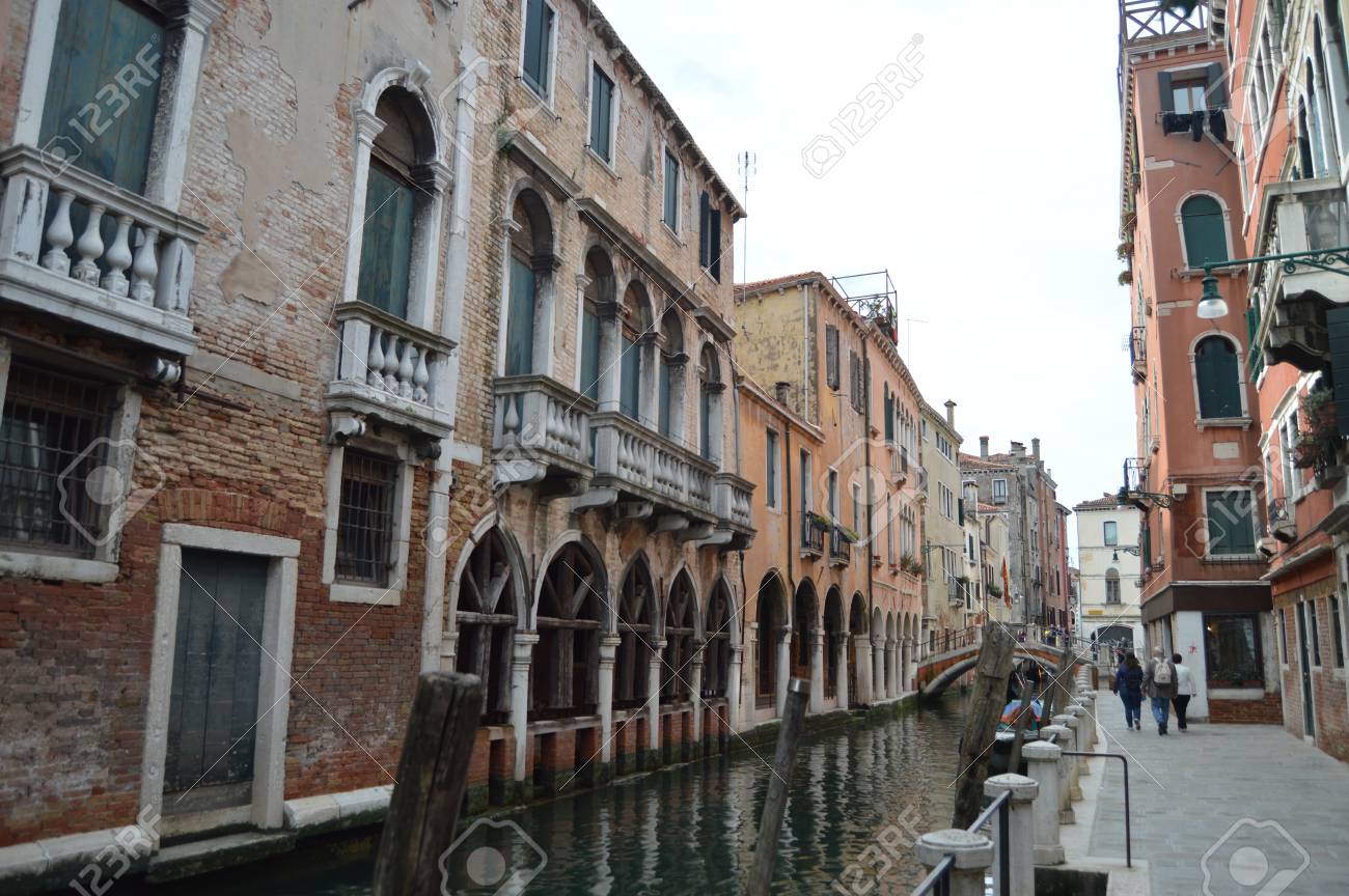 Stone Old Buildings With Windows And Arched Columns In Typical Venetian Style On A Sunny Street Of Venice In Italy Stock Photo Alamy