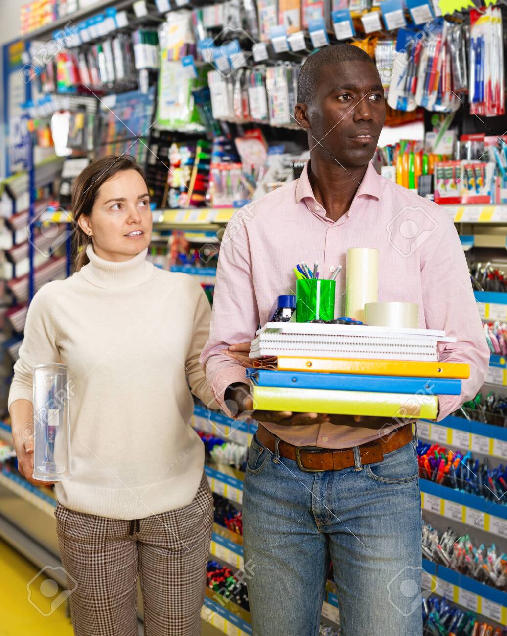 Young Family Couple Holding Stack With Office Supplies In The Stock Photo Picture And Royalty Free Image Image