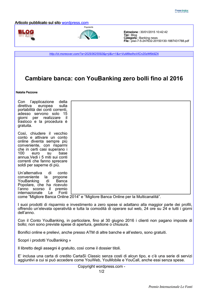 Bonifici disposti allo sportello con. Conto corrente Youbanking davvero conveniente e non solo online Banco Popolare ha fatto per il conto corrente Youbanking una serie di scelte che si muovono in controtendenza rispetto a molti prodotti similari, riuscendo a creare quello che ad oggi risulta essere forse il miglior risultato, in termini di equilibrio, tra banca tradizionale e banca online. Da 00€ a € di plafond richiedibile;.