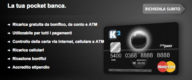 La Carta Conto K2 di Youbanking è una carta di credito prepagata ricaricabile che funziona quasi come un conto corrente Gestione completamente online o da cellulare, pagamenti su circuito Mastercard, invia e riceve bonifici, ricarica gratuita da bonifico Quanto costa, spese di bollo, impressioni ed opinioni personali, alternative. YouBanking è l'offerta di Banco Popolare che permette l'apertura e la gestione online dei rapporti con la banca Fra i servizi offerti da YouBanking sono inclusi diversi prodotti di conti correnti, conti deposito e carte conto L'offerta online comprende un'assistenza multicanale grazie alla quale è possibile operare da PC, da smartphone e via telefono. Conto corrente di Youbanking Il conto corrente di Youbankingit è un conto online a costo zero di Banco PopolareQuesto gruppo bancario è nato nel 07 grazie alla fusione tra la Banca Popolare Italiana e il Banco Popolare di Verona e Novata, ed è anche la banca più grande di matrice cooperativa.