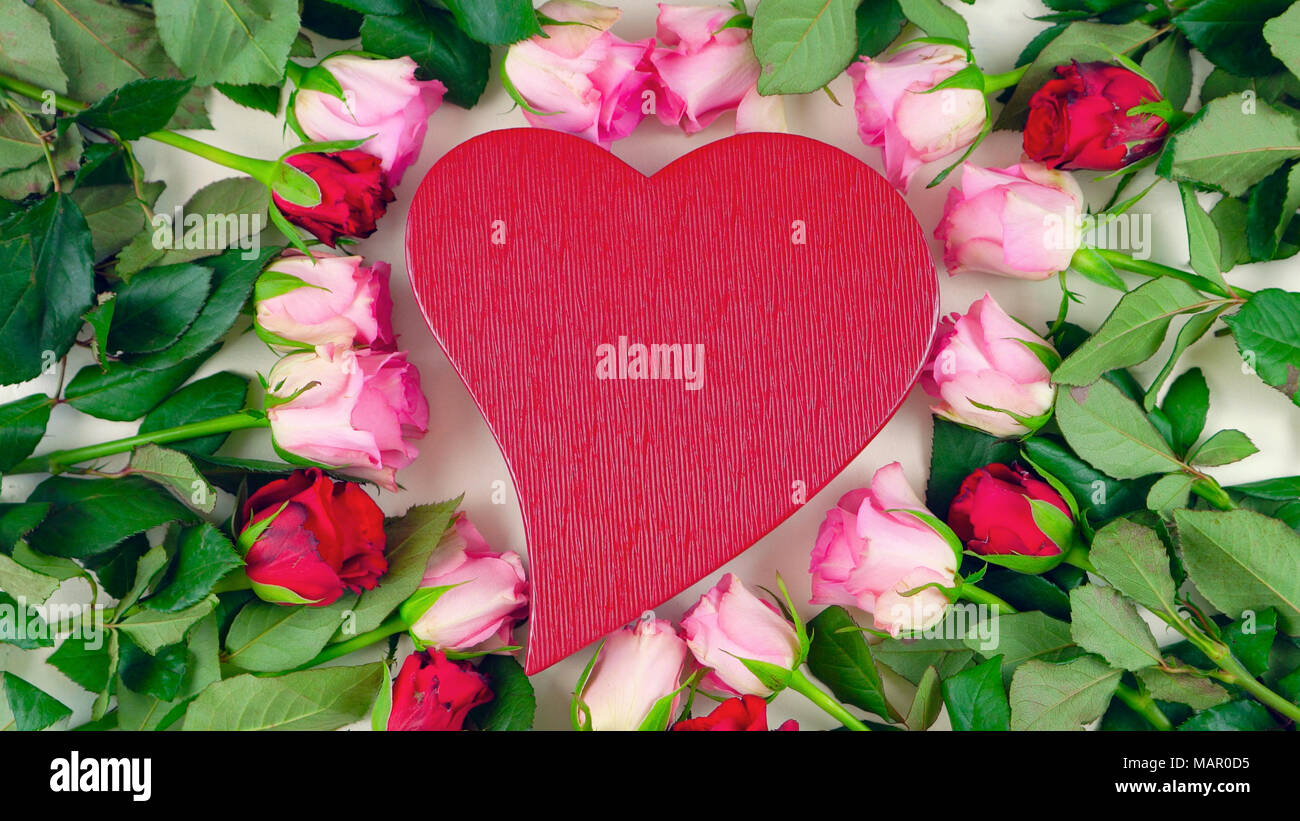 Cuore Rosso Confezione Regalo Circondato Da Rosa E Rose Rosse Per La Festa Della Mamma San Valentino O Sorpresa Di Compleanno Overhead Foto Stock Alamy