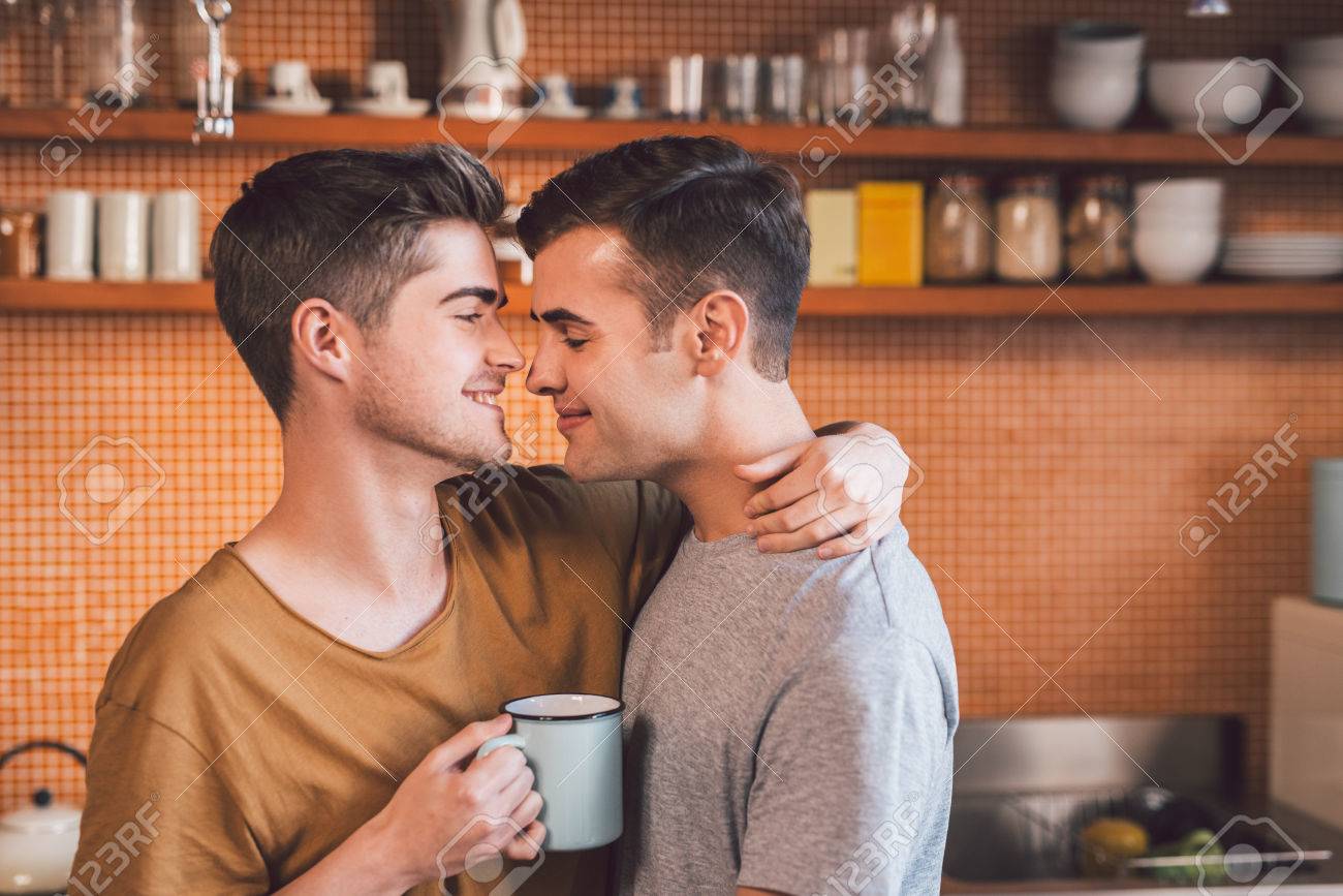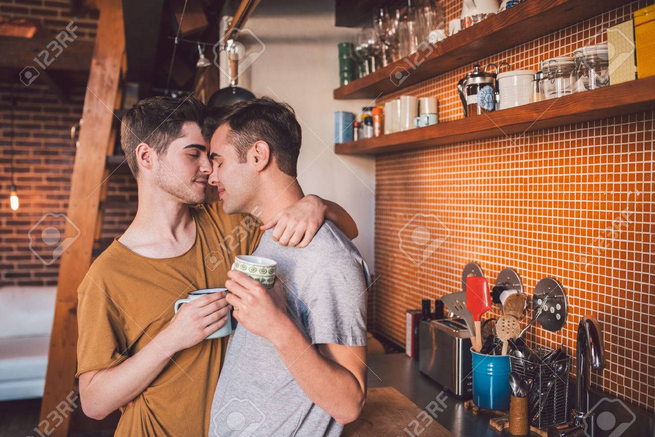 Immagini Stock Affettuoso Giovane Coppia Gay In Piedi A Braccetto Insieme Mentre Beve Il Caffe In Cucina Al Mattino Image