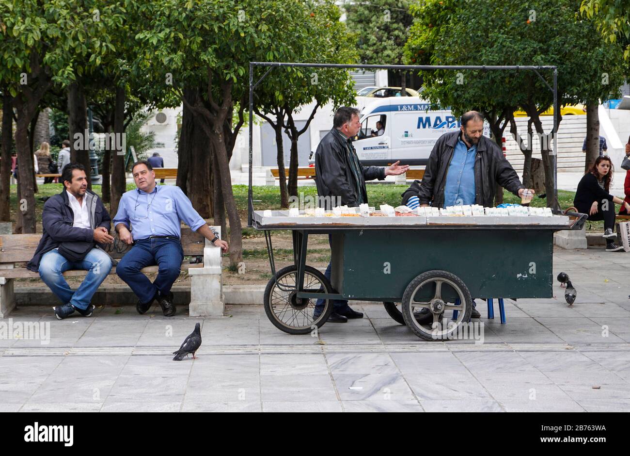 Un Trader Greco Vende Noci A Piazza Syntagma Su 11 04 16 Due Uomini Seduti Su Una