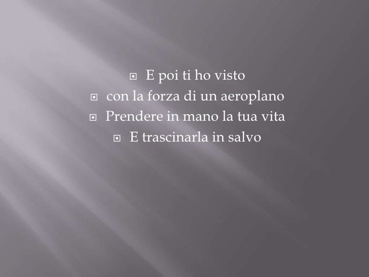 Ti ho vista piangere. Ti ho vista illuminare il mondo con un sorriso, ti ho vista piangere e soffrire, ti ho sentita respirare mentre dormivi, ti ho vista andare via per sempre e ancora ti vedo, e ancora ti sento e ancora ti amo. Ho i sensi deboli che pensi che non tremi Io lo so che sguardo naviga al largo di quegli occhi so che scioglierà come fumo l'incantesimo ma poi mi brucia dentro la tua sete il mio tormento Sei l'unica voglia che non vorrei ti ho vista piangere su di me ma sono il tuo passato ormai. Ho i sensi deboli che pensi che non tremi Io lo so che sguardo naviga al largo di quegli occhi so che scioglierà come fumo l'incantesimo ma poi mi brucia dentro la tua sete il mio tormento Sei l'unica voglia che non vorrei ti ho vista piangere su di me ma sono il tuo passato ormai.