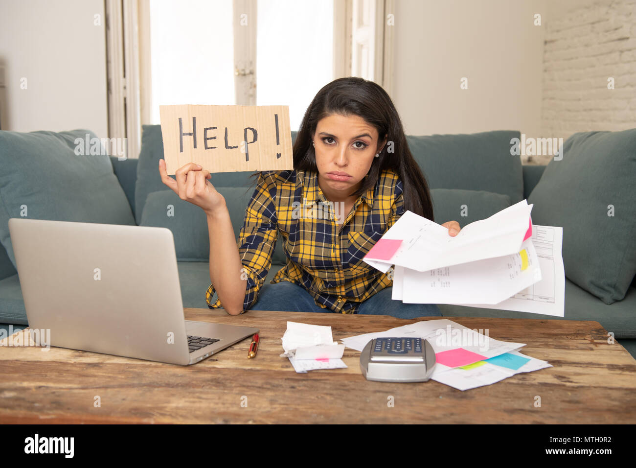 Giovane Donna Preoccupati Di Stress Bancarie E Contabili Fatture Di Debito Carte Bancarie Le Spese E I Pagamenti Con Il Computer A Casa Per Chiedere Aiuto Sentirsi Desp Foto Stock Alamy