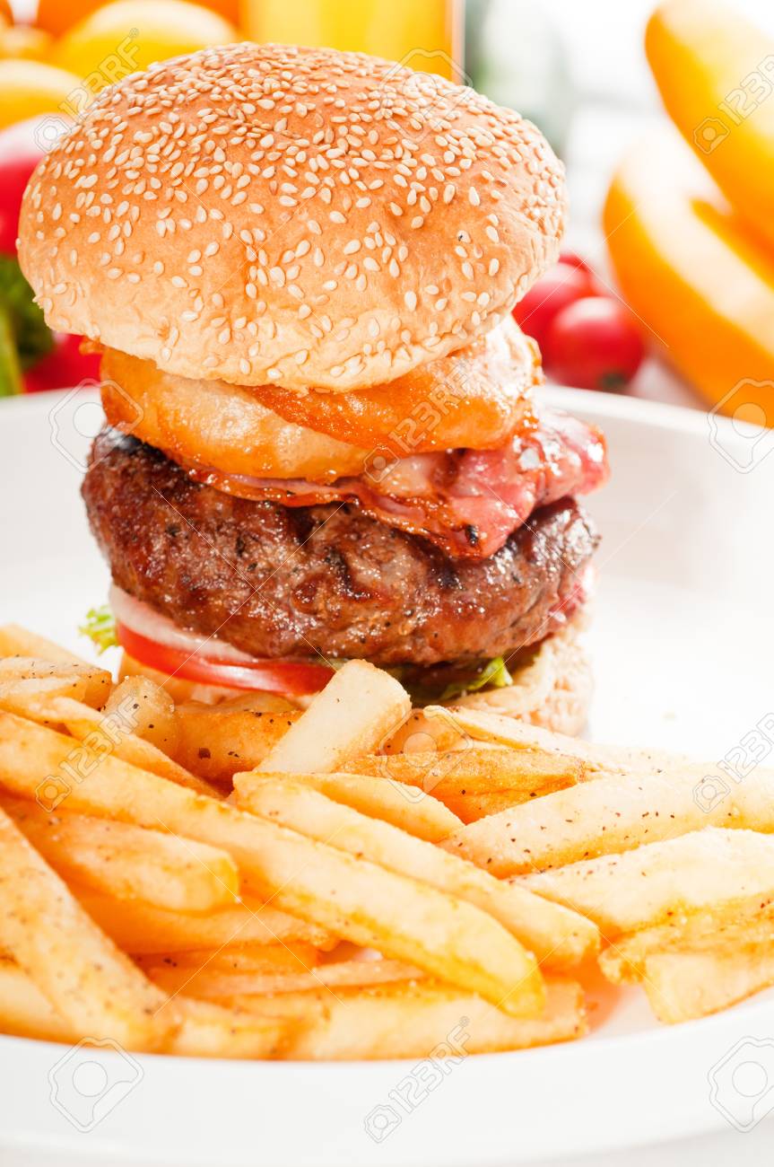 Immagini Stock Classico Panino Hamburger Americano Con Anelli Di Cipolla E Patatine Fritte Il Cibo Piu Delizioso Portafoglio Image